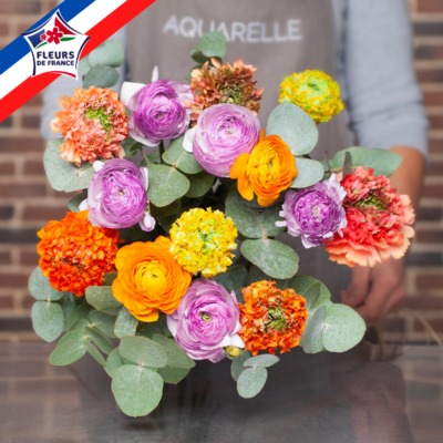 Aquarelle a confectionné un merveilleux bouquet de roses colorées. Découvrez les variétés 'Aqua', 'Red Calypso', 'Tropical Amazone', 'Sonrisa' et 'Wild Calypso', connues pour leur tenue en vase, leurs teintes incroyables et le parfait épanouissement de leurs boutons.