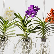 Arrosage : l’arrosage de l’orchidée Vanda doit être méticuleux. Les Vanda, comme toutes les plantes tropicales, ont besoin d’une certaine humidité, notamment en période de croissance. Mais attention, l’eau stagnante leur est néfaste car elle entraîne le pourrissement des racines, puis de la plante entière. Évitez aussi d’arroser par le haut pour ne pas risquer de laisser de l’eau dans la rosette de feuilles. Procédez plutôt par bassinage (qui est en outre le plus efficace), laissez tremper les racines dans l’eau durant 15 à 30 minutes. Videz l’eau et laissez-les s’égoutter (elles doivent devenir vertes après l’arrosage). Bassinez 1 à 2 fois par semaine en hiver et plus régulièrement, du printemps à l’automne. Il est capital de procéder au moins une fois par mois à un rinçage à l’eau claire, c’est-à-dire un arrosage très copieux. De cette manière, on éliminera la plus grosse partie des sels cristallisés en provenance de l’engrais, non consommés par la plante.