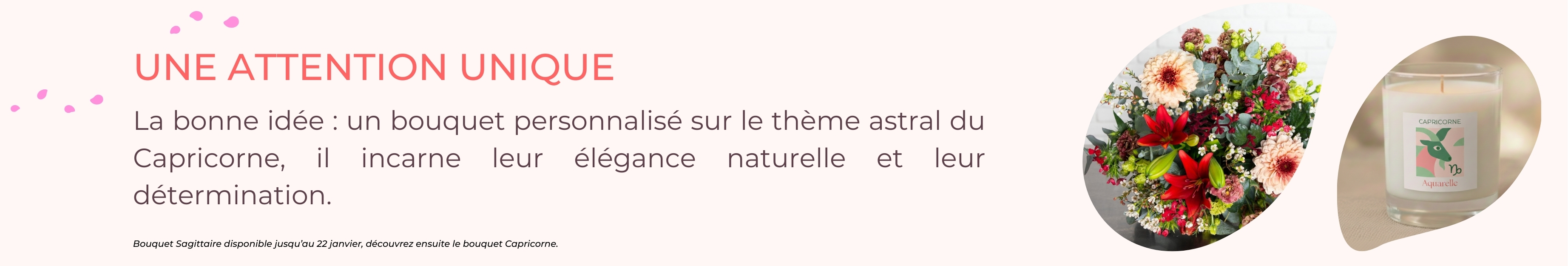 Ce mois-ci, découvrez notre bouquet inspiré des Capricornes, accompagné de son petit livre astral dédié à ce signe de terre emblématique.