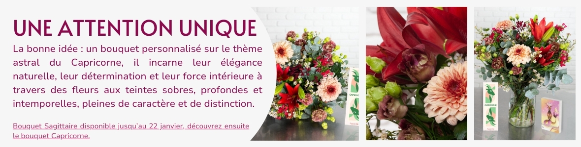 Ce mois-ci, découvrez notre bouquet inspiré des Capricornes, accompagné de son petit livre astral dédié à ce signe de terre emblématique.