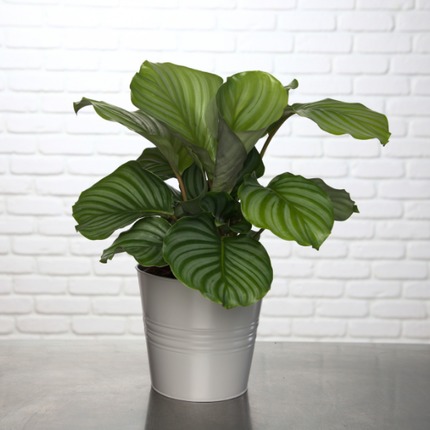 Originally from South America, this Calathea will grace any room or style of decor with its beautifully patterned evergreen leaves and red reverse side. Unlike other plants, it grows in the shade and needs very little light. A superb gift idea with its taupe-coloured zinc pot cover.