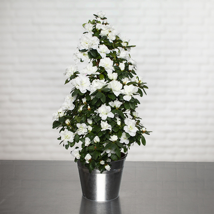 Découvrez cette magnifique variété d'azalée pyramide, sélectionnée pour ses belles fleurs blanches, sa longévité et son allure élégante. Extrêmement florifère, ce petit arbuste vous offrira pendant de longues semaines une floraison dense et généreuse. Il sera accompagné d'un cache pot en zinc naturel.