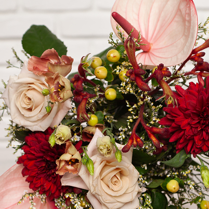 Nos artisans fleuristes ont imaginé une composition élégante mêlant roses poudrées, chrysanthèmes rouges et anthuriums rosés à de délicates notes de lisianthus et d' hypericum dorées.