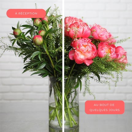 Les pivoines sont expédiées fermées afin de préserver leurs boutons : une fois chez vous ou votre destinataire, elles s’ouvriront rapidement pour révéler toute la beauté de leurs fleurs généreuses et délicates.