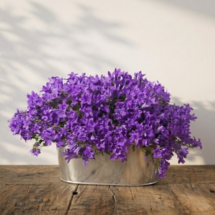 Présentées dans un cache-pot en zinc, ces deux ravissantes campanules offrent une floraison généreuse aux fleurs bleues éclatantes, idéales pour créer une ambiance printanière douce et apaisante.