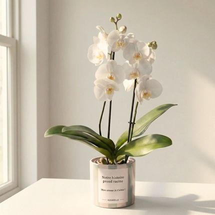 Présentée dans un cache-pot design (cache pot offert - coloris pouvant varier selon les arrivages), cette orchidée peut être accompagnée, en option (+5 €), d’une étiquette personnalisée. Inscrivez-y un prénom, une date, un mot doux et transformer votre plante en un cadeau vraiment personnel.