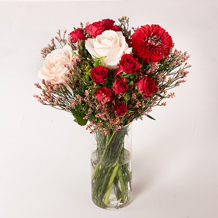 Les roses rouges, symboles intemporels de l’amour passionné, rencontrent la tendresse d’une rose rose aux pétales délicats. Elles sont sublimées par le germini rouge éclatant, qui apporte fraîcheur et modernité, et par de fines touches de limonium rouge, légères et aériennes. Le tout est structuré par un feuillage vert naturel, pour un rendu à la fois romantique et lumineux.