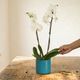 Parmi notre sélection d'orchidées, ce Phalaenopsis blanc se distingue par la pureté de ses fleurs fleurs, ainsi que la délicate courbe formée par la hampe. Cette orchidée blanche sera accompagnée de son cache-pot en céramique. Un cadeau élégant qui sera très apprécié.